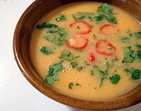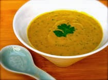 Misture o sumo de cenoura, o gengibre e o abacate até ficar homogéneo. Use só as folhas do coentro e as folhas de salsa. Adicionar as sementes de coentro, o azeite e o shoyu. Pulse em velocidade média até ficar bem misturado, mas com pequenos pedaços de ervas ainda visíveis. Tempere com uma pitada de sal, a gosto. Salpique cebolinha por cima. Sirva gelado. Decore com sementes de coentro picado ou sementes de sésamo branco e preto.